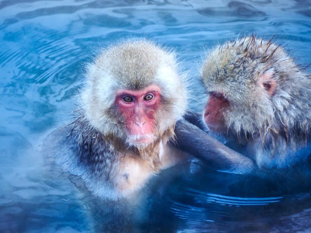 Point de croix | Babouin – Singe brun dans l'eau bleue