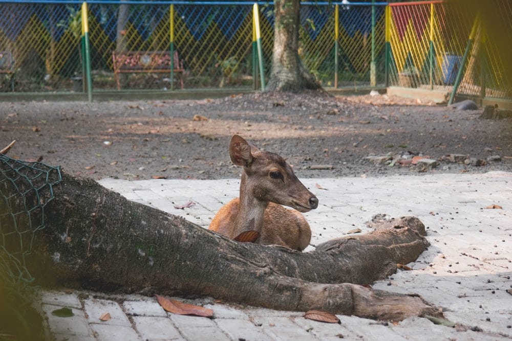 Point de croix | Armadillo – Cerf assis à côté d'une racine d'arbre