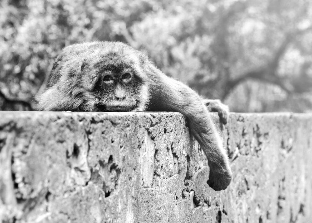 Point de croix | Singe - Singe sur un tronc d'arbre en photographie en niveaux de gris