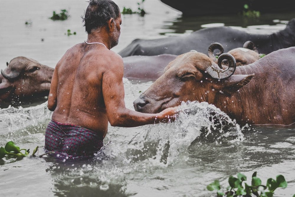Point de croix | Bœuf – Personne sur un plan d'eau entouré de buffles