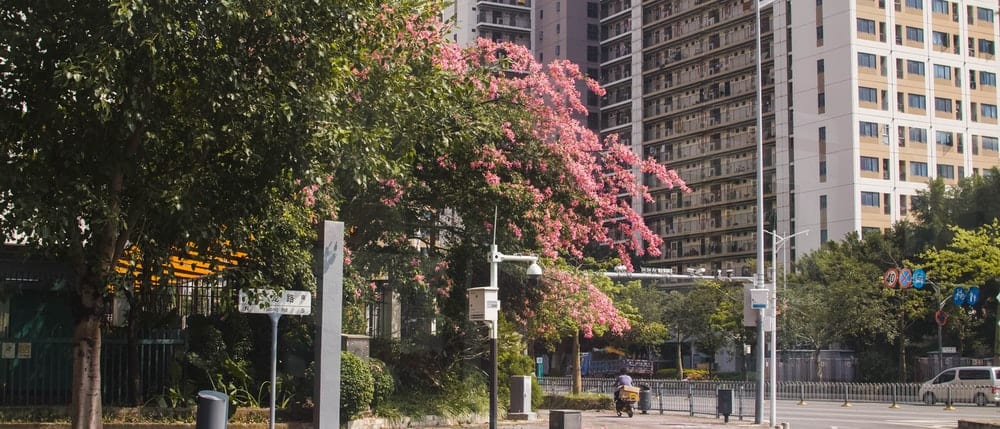 Cross Stitch | Shenzhen - Pink Leaf Tree Near White Concrete Building During Daytime